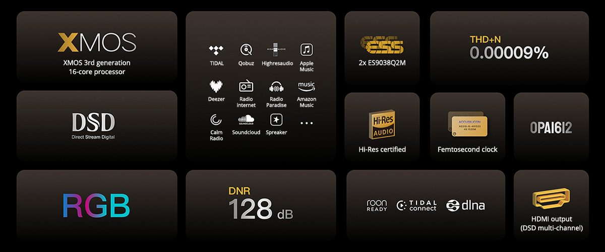 Druhá generace HighEnd streamerz DMP-A6 Master Edition. Streamer, D/A převodník, předzesilovač a domácí hub pro správu a sdílení veškeré vaší hudby. Čtyřjádrový procesor ARM Cortex-A55, operační paměť 4 GB DDR4, úložiště dat 32 GB, Bluetooth 5.0, kodeky SBC, AAC, aptX, aptX LL, aptx HD, LDAC.