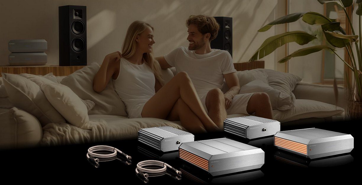 Dvojice výkonových monobloků pracujících ve třídě AB - v sestavě s napájením Fusion Core.