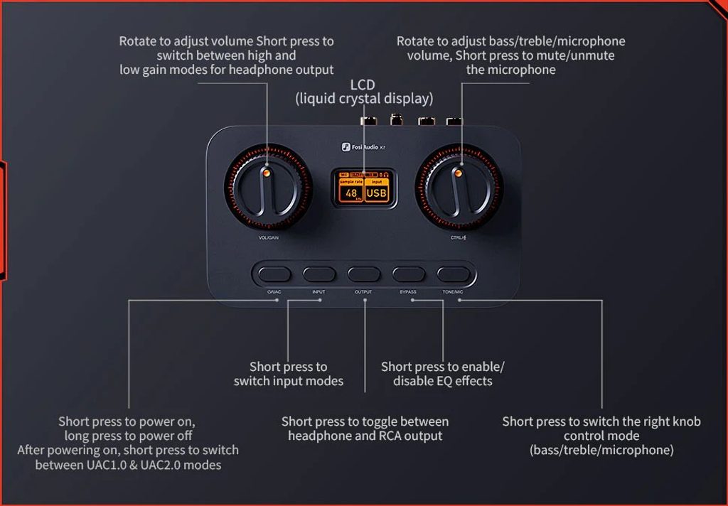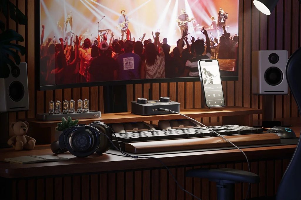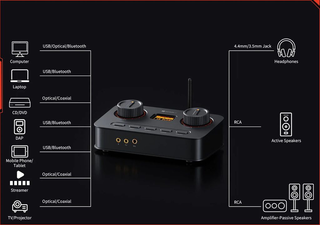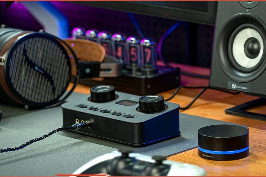 Herní sluchátkový zesilovač s vlastním D/A převodníkem, symetrickým sluchátkovým výstupem a vstupem pro mikrofon.