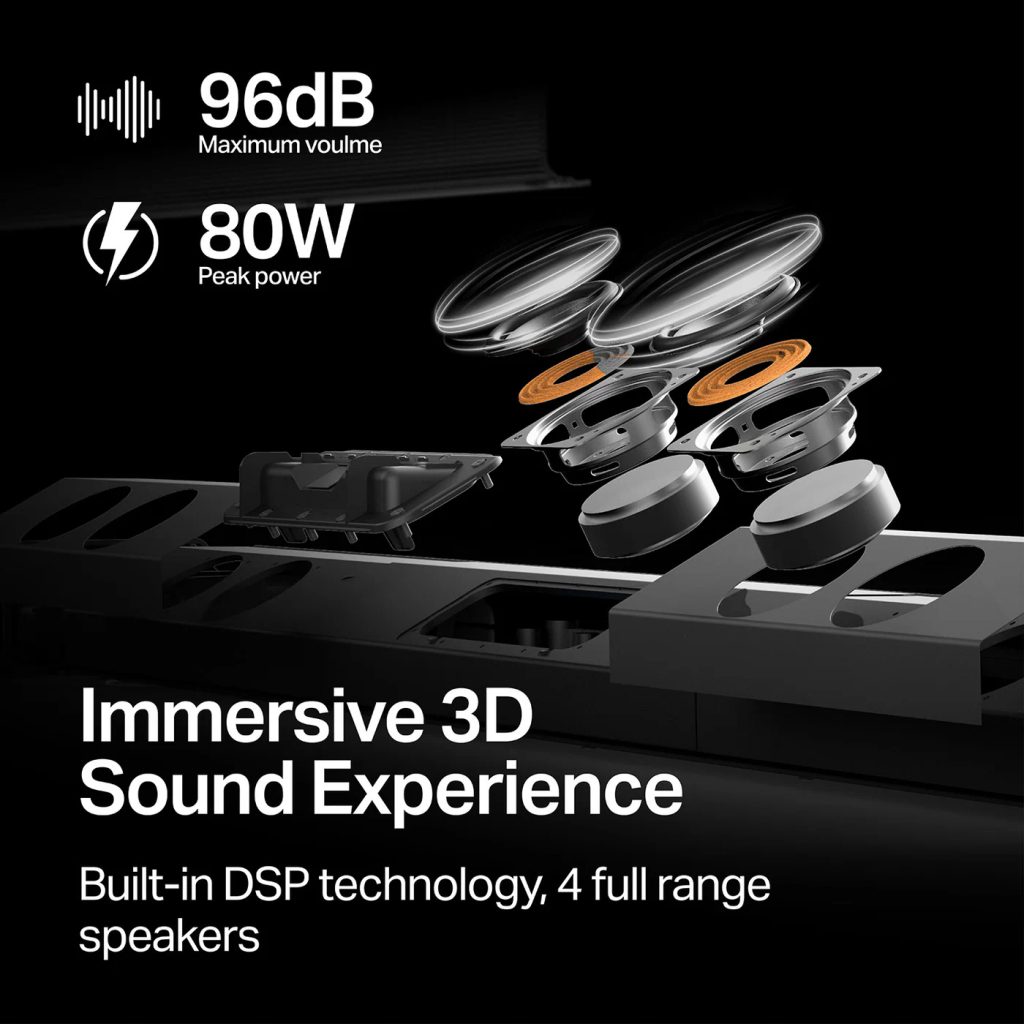 Soundbar pro TV a domácí kino s Bluetooth 5.0, čtyřmi širokopásmovými reproduktory, basreflexem, 3D surround zvukem, vylepšením srozumitelnosti dialogů, vstupy: AUX, optický a koaxiální, tři zvukové režimy a možnost montáže na zeď, výkon ve špičce až 80 W, maximální hlasitost až 96 dB.