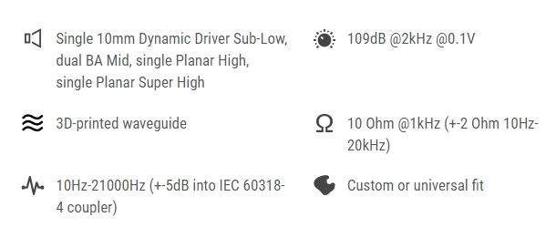 HighEnd in-ear sluchátka s pěticí měničů v konfiguraci Tri-brid (3 typy měničů). Nechybí technologie Flat Impedance. 1 dynamický měnič (basy), 2 měniče BA (středy), 2 měniče Planar Magnetic (výšky). Odpojitelný kabel (2pin) splétaný, 8žilový. Tělo vyrobené 3D tiskem z pryskyřice, rozsah 10 - 21.000 Hz, 10 ohmů.