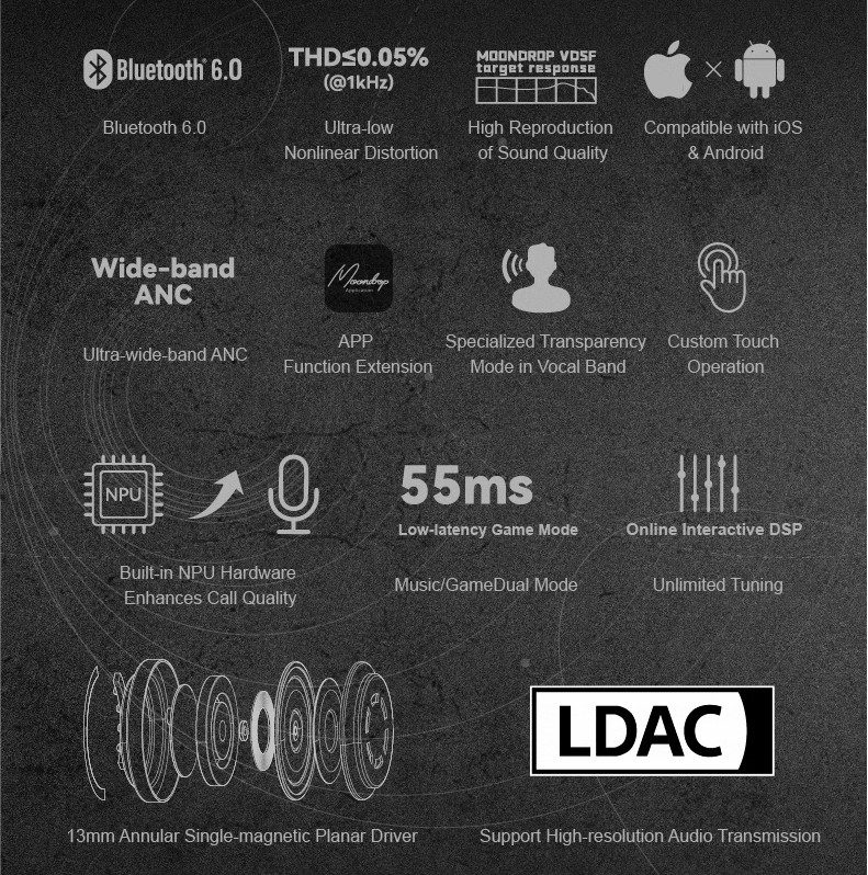 | Kompatibilita | Game Mode 55 ms, EQ, Moondrop App, Dual Device Connect |
