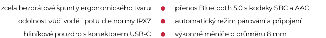 | Kompatibilita | Odolnost IPX7, Bluetooth 5.0, kodeky SBC a AAC |