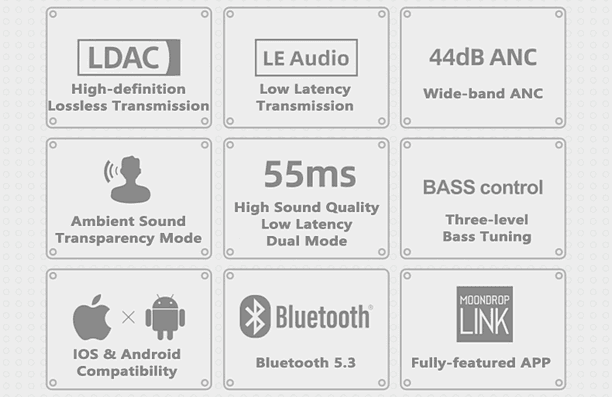 Bezdrátová TWS sluchátka s aktivním potlačením hluku ANC, herním režimem Low Latency a 13mm magnetoplanárními měniči. Bluetooth 5.3 s kodeky LDAC i LC3, výdrž 6 + 18 h s pouzdrem. Funkce Ambient Sound / Transparency, korekce BASS Control, podpora aplikace Moondrop Link.