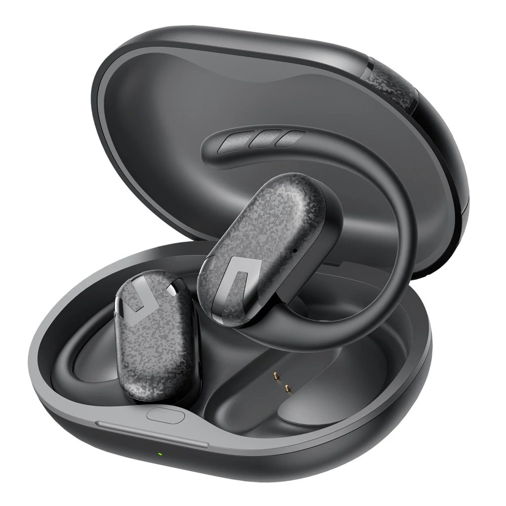 Bezdrátová sluchátka s otevřenou konstrukcí, dynamické měniče 12 mm, nízká hmotnost 8.43 g na sluchátko, nastavitelné otočné háčky za uši s rotací až 90°, duální mikrofony, AI potlačení hluku při hovorech, Bluetooth 5.4, výdrž baterie 10 + 40 h, multipoint konektivita, IPX4, nabíjení přes USB-C.