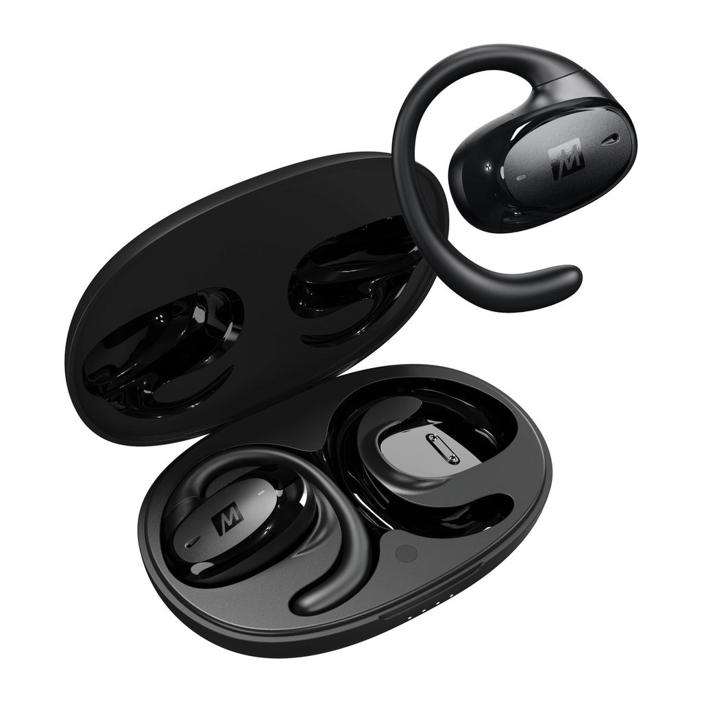 Sportovní otevřená Bluetooth sluchátka na uši. Dynamické měniče s průměrem 16.2 mm, ENC technologie snížení hluku při telefonování, dotykové ovládání, ochrana proti vodě IPX4, dvě velikosti háčků za uši, výdrž baterie 11 hodin, až 33 hodin s použitím dobíjecího pouzdra, bezdrátové nabíjení