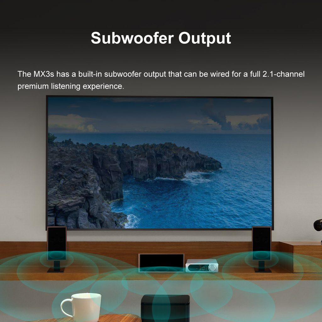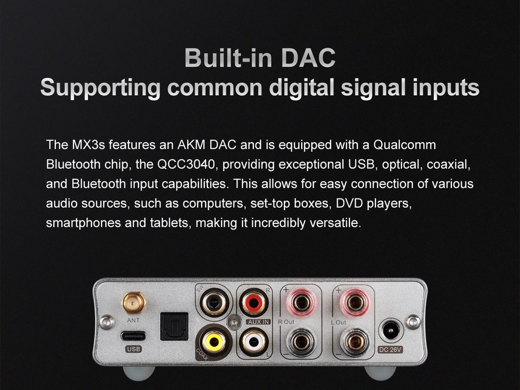 DAC / sluchátkový zesilovač / výkonový zesilovač / Bluetooth přijímač v jediném přístroji. Výkon 2x 50 W, 2x 700 mW pro sluchátka. Vstupy Bluetooth, USB, Optika, Coax, Aux. DAC podporuje až 192 kHz / 24 bit, nechybí výstup pro subwoofer ani dálkové ovládání v balení.