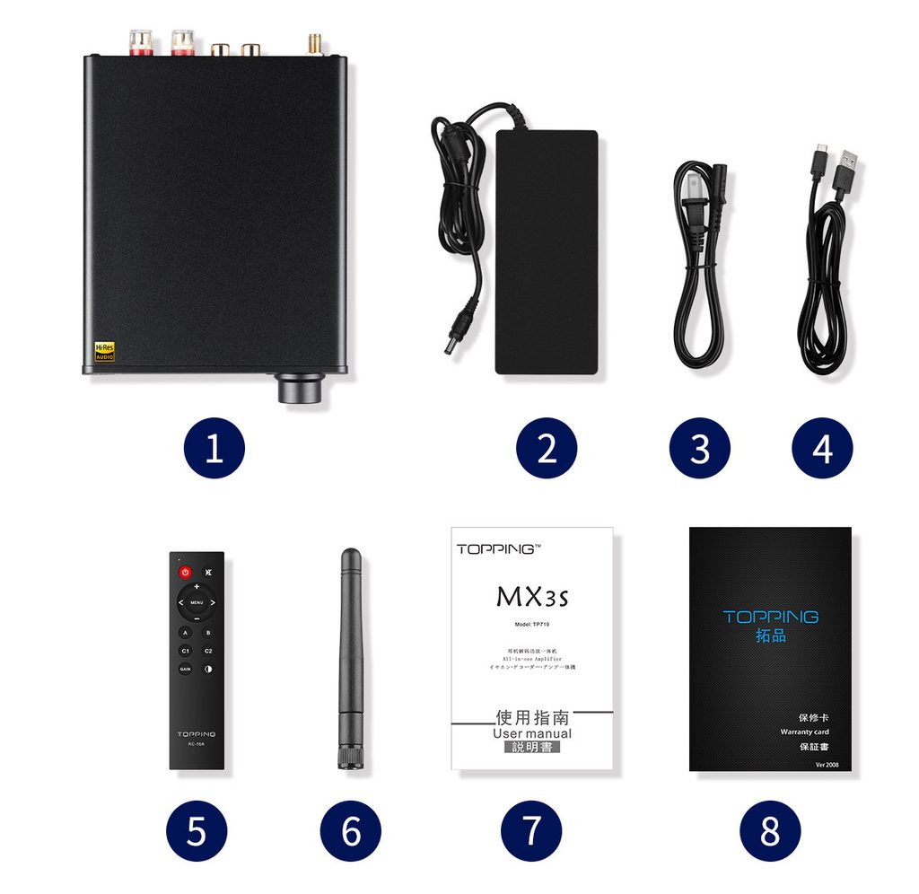 | Příslušenství v balení | BT anténa, napájecí trafo, USB-C kabel, dálkové ovládání |